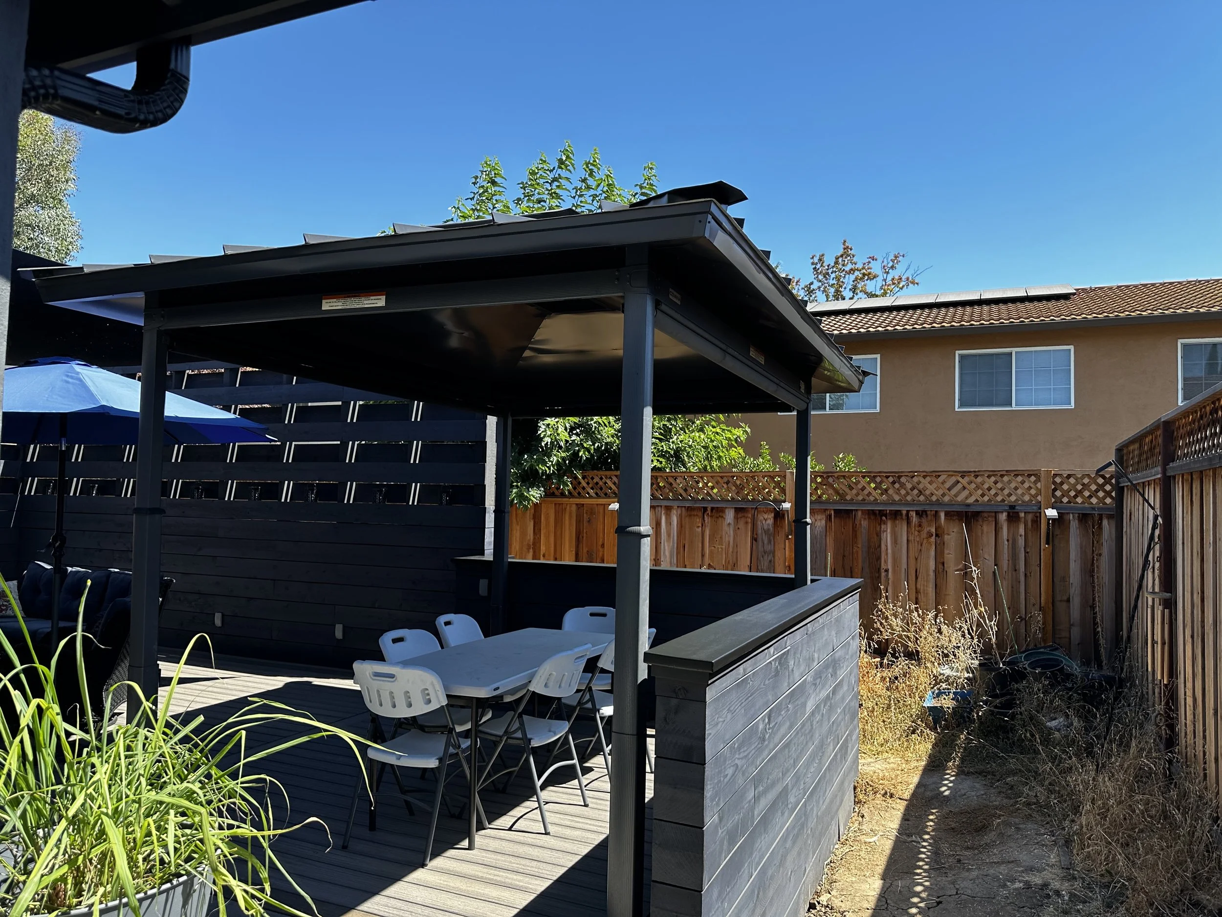 Covered patio renovation featuring custom overhead framing that defines a shaded outdoor gathering space and creates a seamless continuation of the home.
